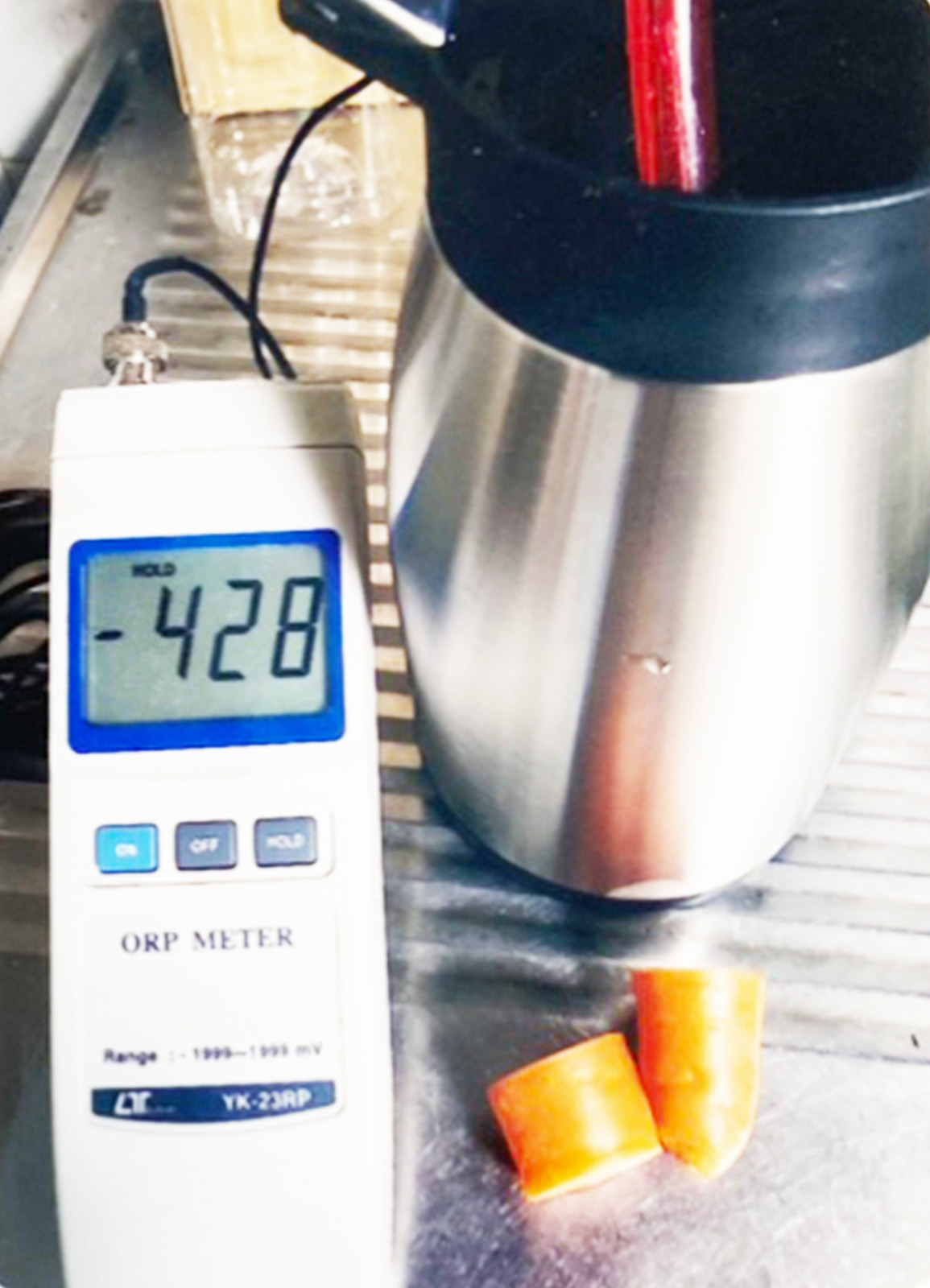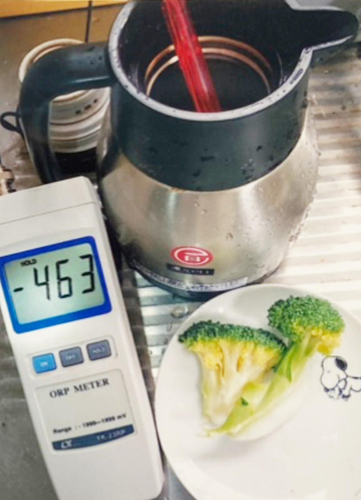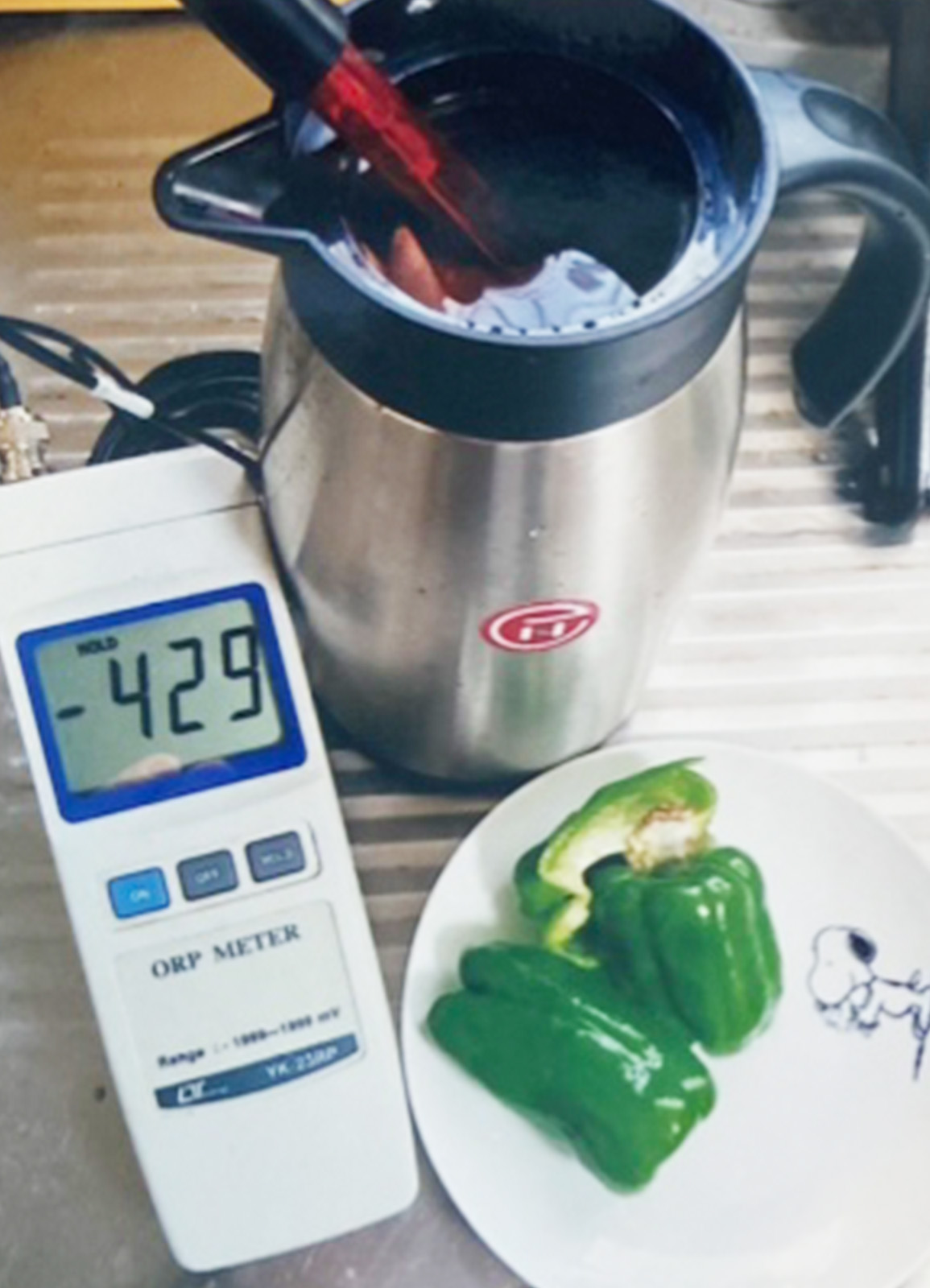 お茶や野菜・フルーツが入った保温ポットに「還元ロボ」を入れておくと、時間とともに低電位化していき、同時に水素量も増えていきます。
