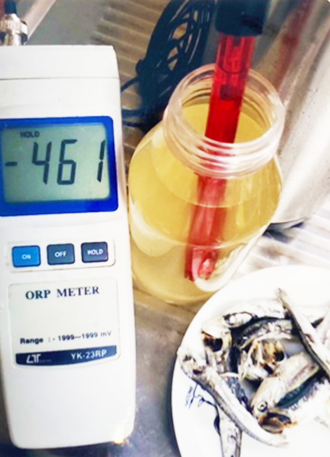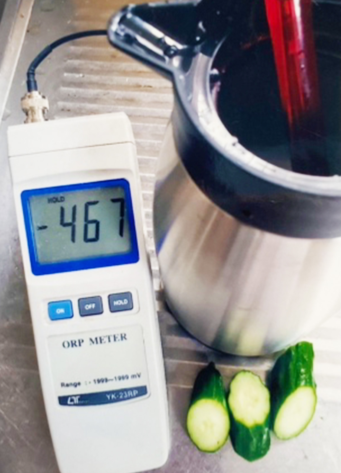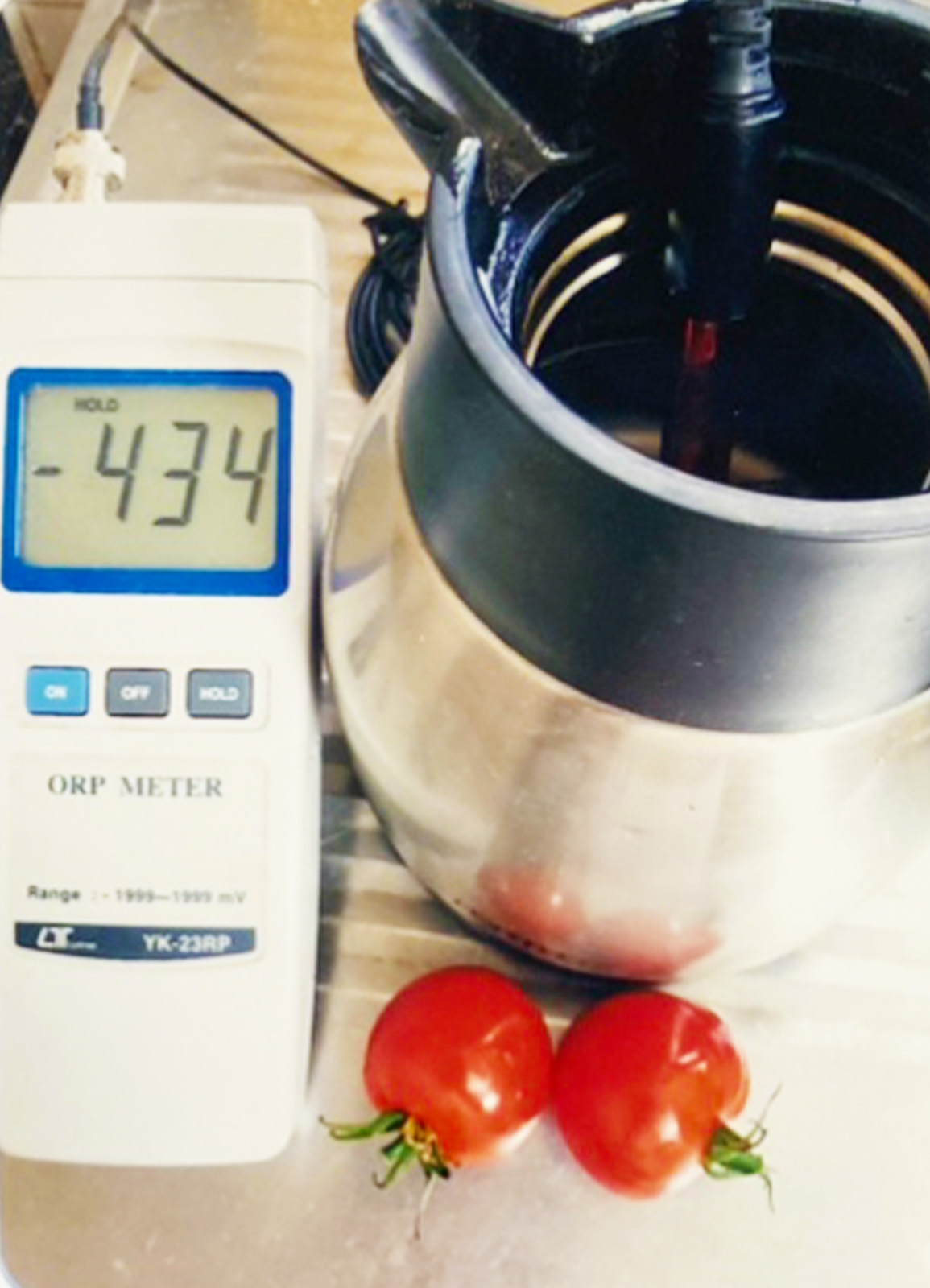 お茶や野菜・フルーツが入った保温ポットに「還元ロボ」を入れておくと、時間とともに低電位化していき、同時に水素量も増えていきます。